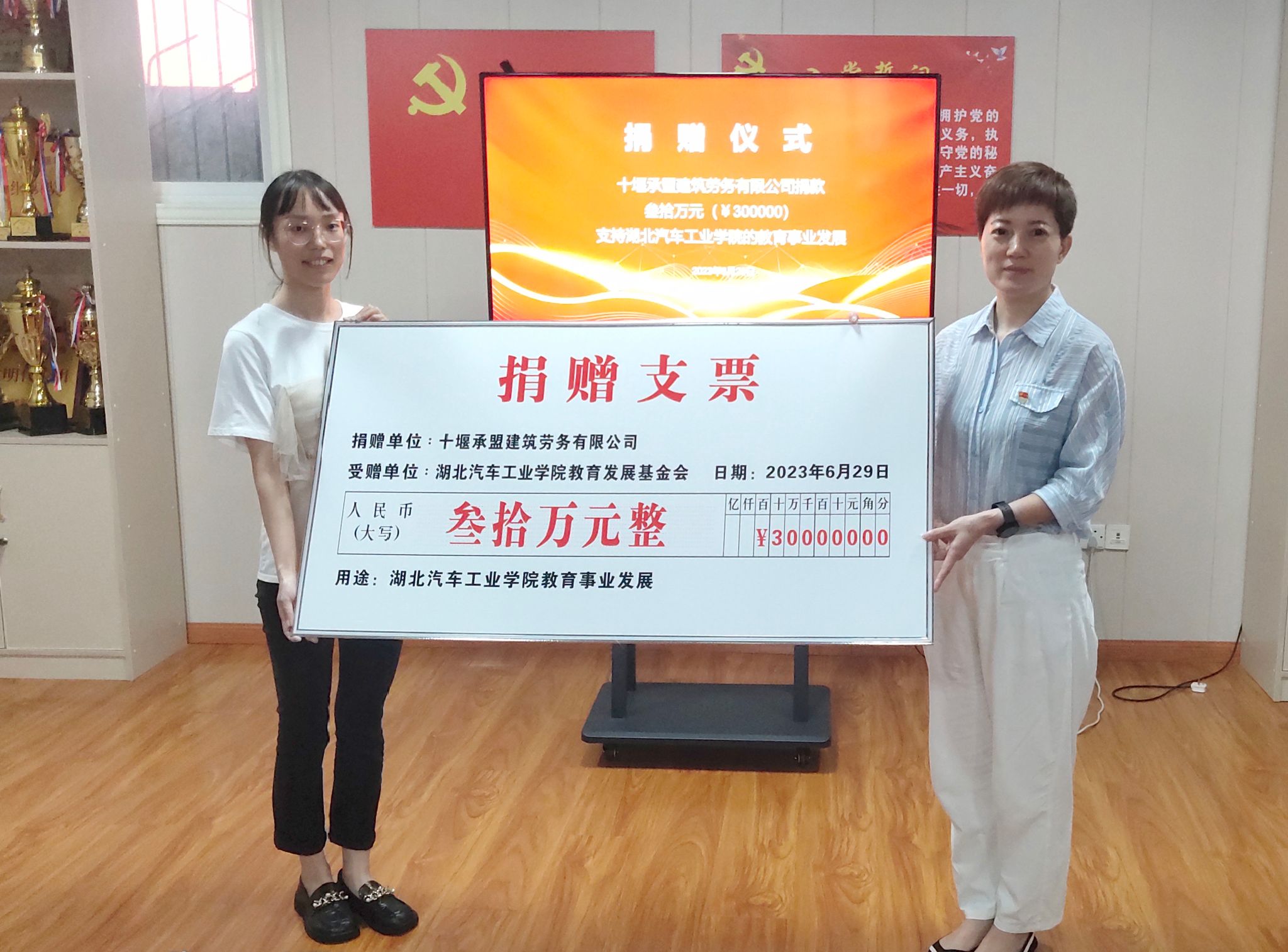 最后,刘梦霏代表十堰承盟建筑劳务有限公司向公司捐赠30万元,熊玲代表公司颁发捐赠荣誉证书。
