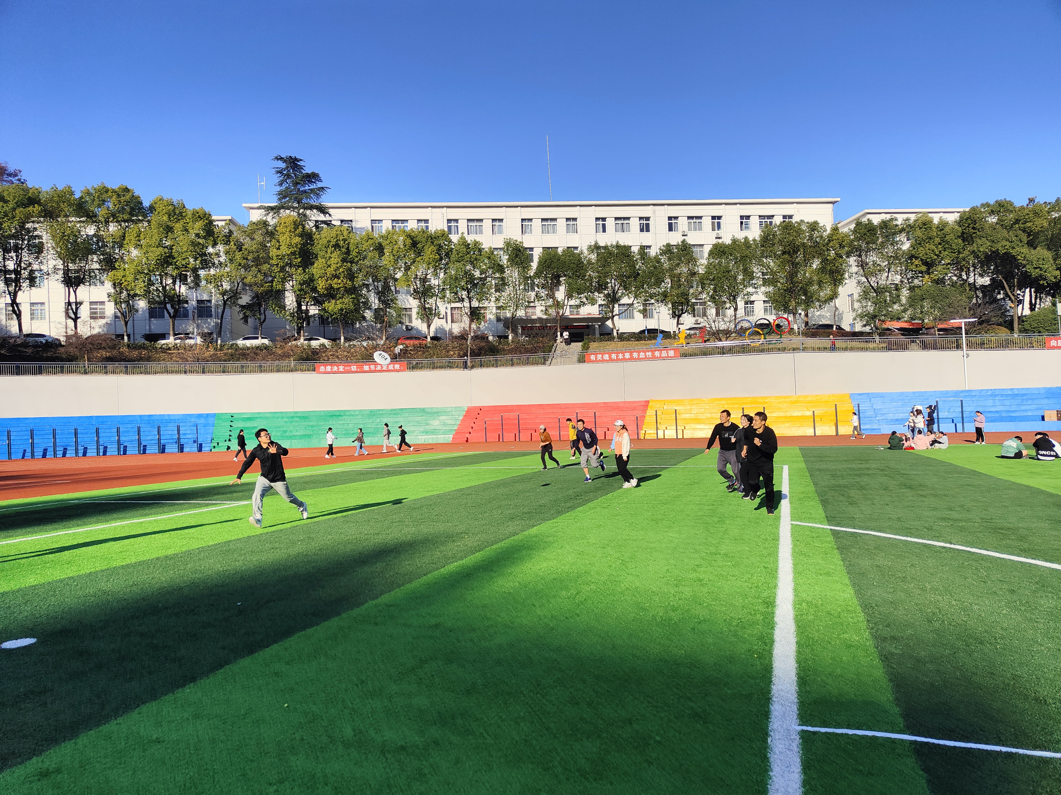 在活动中张园老师介绍了极限飞盘运动的竞赛规则及运动特点,然后详细讲解了极限飞盘的正手传盘技术、反手传盘技术以及双手接盘技术要领,并且带领全体教师练习了传接盘技术。最后全体教师分成两队进行了极限飞盘的团队比赛,在友好和激烈比赛中结束了本次活动。