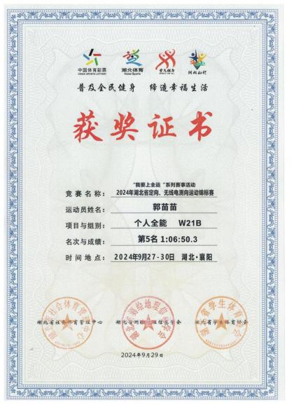 9.2024年“我要上全运”系列赛事活动,湖北省定向,无线电测向运动锦标赛个人全能W21B组第5名