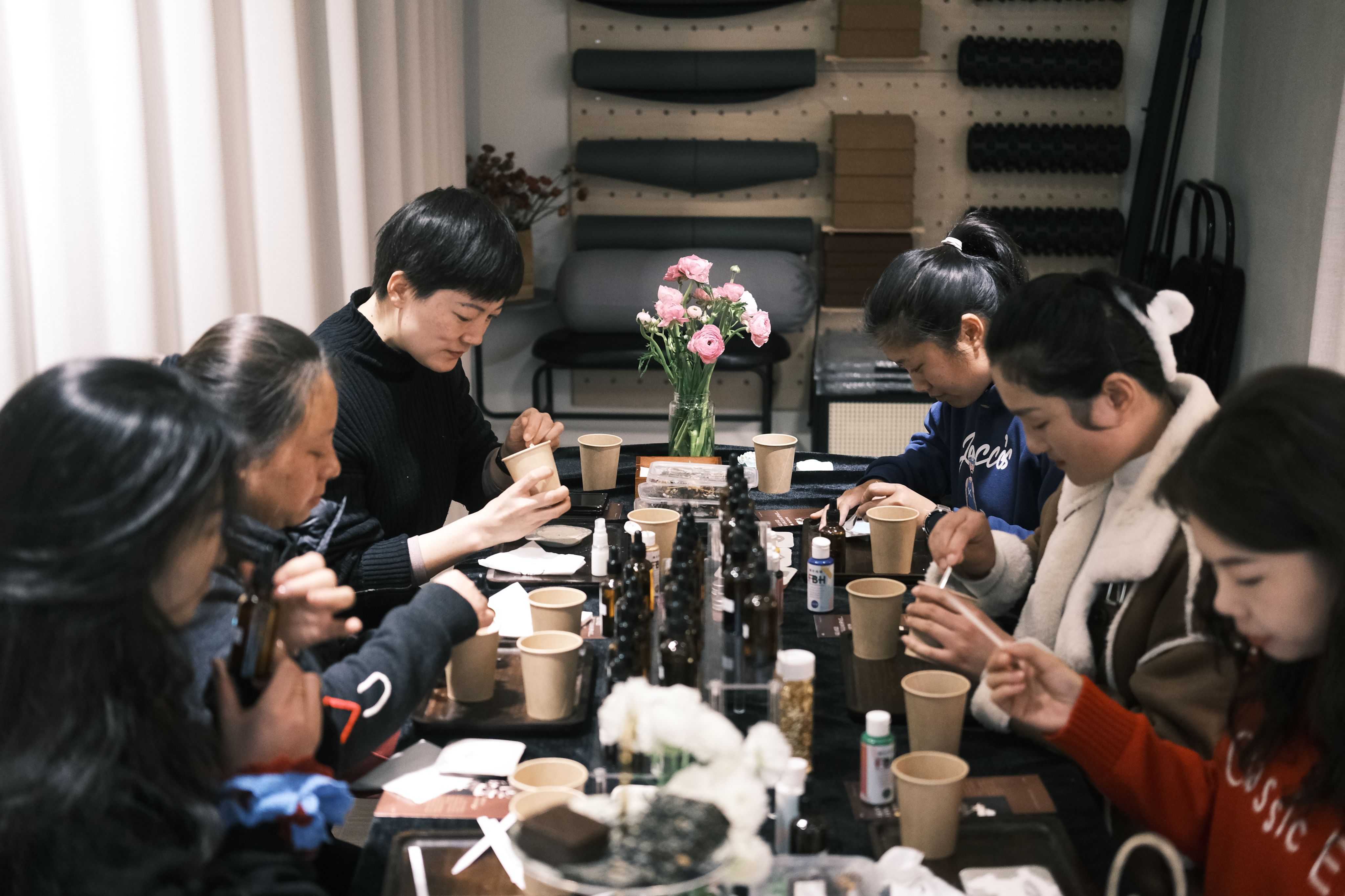 活动开始前,工作人员提前筹备了齐全的材料与工具,从不同款式的香牌模具、天然石膏粉,到各类香型的精油、精致的挂绳配饰等,一应俱全。同时还邀请了有手工制作经验的老师现场指导,为大家讲解石膏香牌的制作流程、配比技巧以及精油调配的小窍门。“先将石膏粉和水按照比例搅拌均匀,注意要顺着一个方向搅,避免产生气泡,之后加入喜欢的精油,再倒入模具等待定型就可以了。”指导老师一边演示,一边耐心解答大家提出的疑问。